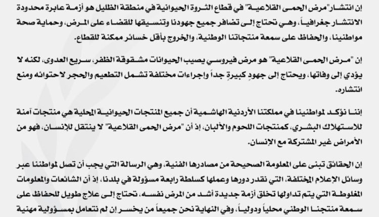 إننا نؤكد لمواطنينا في مملكتنا الأردنية الهاشمية أن جميع المنتجات الحيوانية المحلية هي منتجات آمنة للاستهلاك البشري, كمنتجات اللحوم والألبان, إذ أن “مرض الحمى القلاعية” لا ينتقل للإنسان, فهو من الأمراض غير المشتركة مع الإنسان.