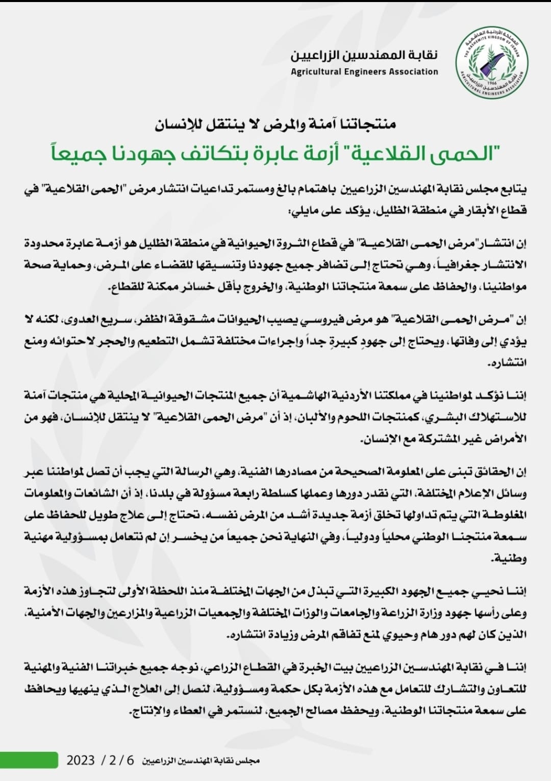 وكالة الناس – يتابع مجلس نقابة المهندسين الزراعيين باهتمام بالغ ومستمر تداعيات انتشار مرض “الحمى القلاعية” في قطاع الأبقار في منطقة الظليل, ويؤكد على مايلي:
