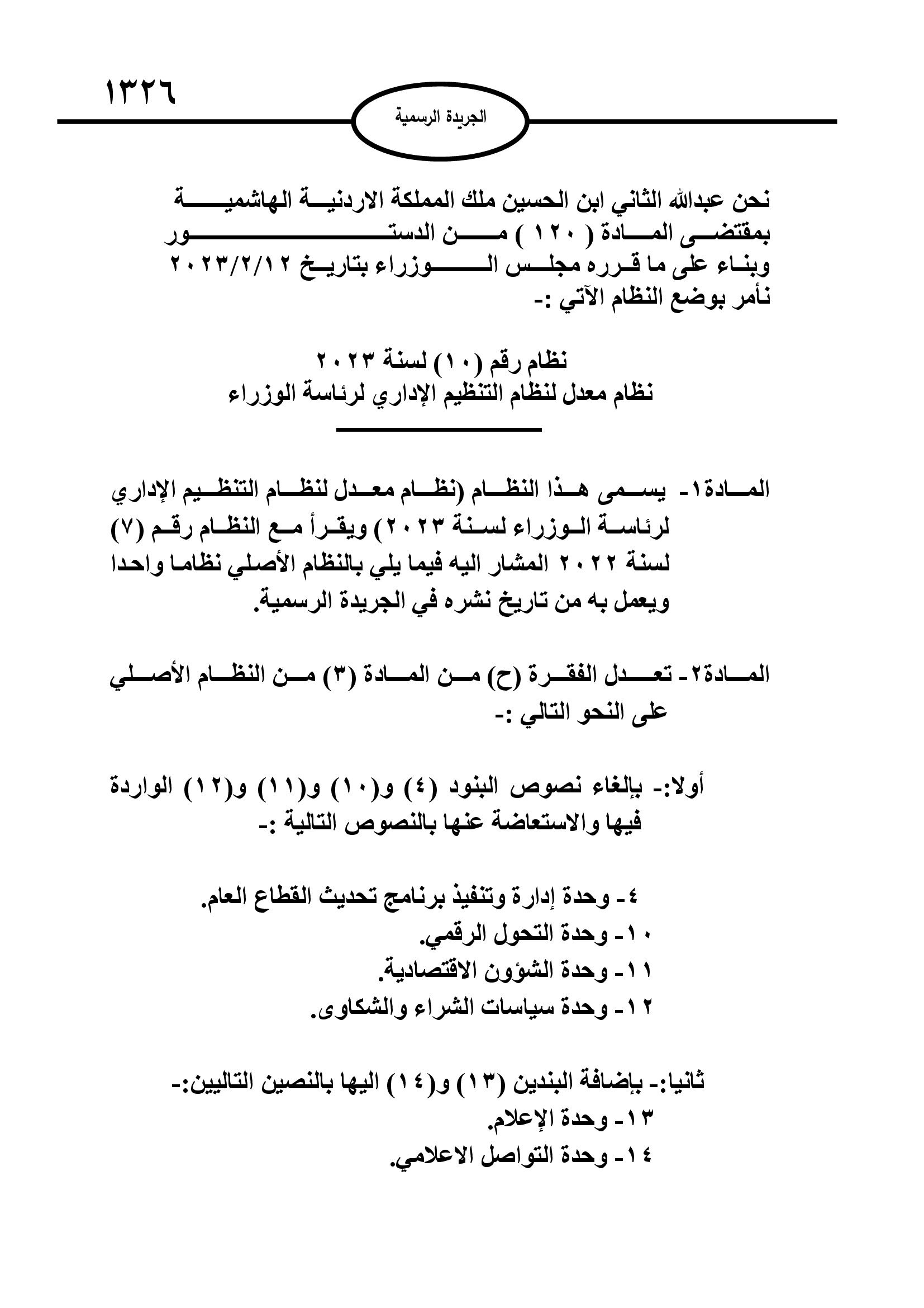 وكالة الناس – صدرت الإرادة الملكية السامية بالموافقة على النظام المعدل لنظام التنظيم الإداري لرئاسة الوزراء لسنة 2023، بحسب عدد الجريدة الرسمية الخميس.
