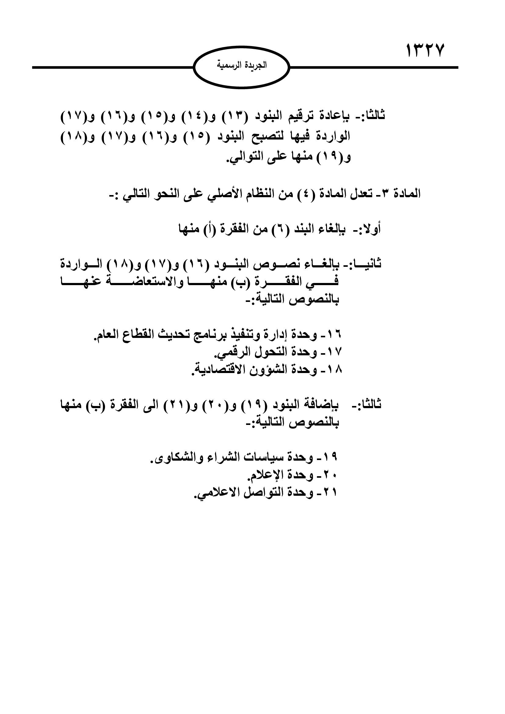 وبحسب النظام المعدل، فانه تم استحداث ست وحدات جديدة؛ وحدة إدارة وتنفيذ برنامج التحديث العام، ووحدة التحول الرقمي، ووحدة الشؤون الاقتصادية، ووحدة سياسات الشراء والشكاوى، ووحدة الإعلام، ووحدة التواصل الإعلامي.
