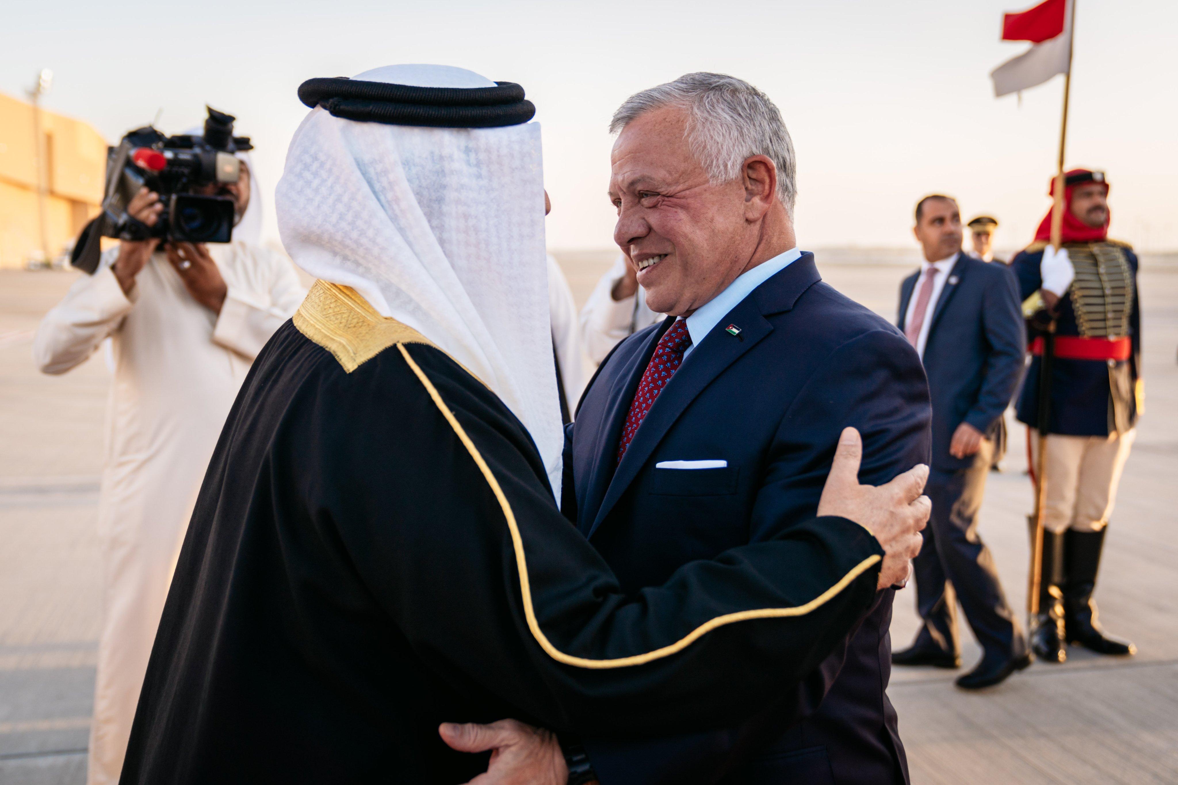 ووصل جلالة الملك اليوم إلى قاعدة الصخير الجوية، إذ كان في استقباله جلالة الملك حمد بن عيسى آل خليفة وسمو الأمير سلمان بن حمد آل خليفة وعدد من أصحاب السمو الشيوخ في مملكة البحرين، والسفير الأردني في المنامة رامي وريكات.
