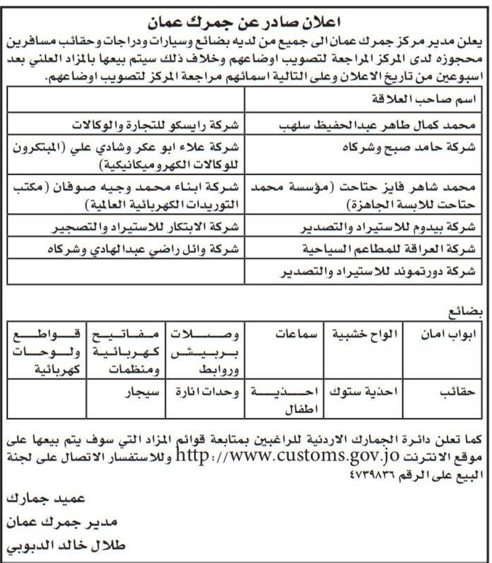 مطلوبون للمراجعة في جمارك عمّان ( أسماء ) On أبريل 18, 2023 Share وكالة الناس – دعا مدير مركز جمرك عمان التالية أسماؤهم إلى مراجعة المركز لتصويب أوضاع دراجاتهم وسكوتراتهم وسياراتهم التي تم ضبطها بحوزتهم .