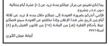 وكالة الناس – أنذرت أمانة عمّان الكبرى، اليوم الأربعاء، عدداً من موظفيها، لغيابهم عن العمل أكثر من 10 أيام.