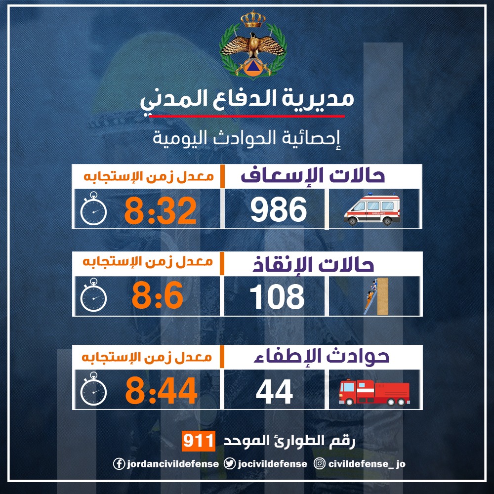 وكالة الناس – تعاملت مديرية الدفاع المدني خلال الــ 24 ساعة الماضية والتي صادفت اول ايام عيد الفطر مع (986) حالة اسعافية مختلفة وبمعدل زمن الاستجابة (8:32) دقيقة.، حيث تم إجراء اللازم لهم وتأمين وصولهم إلى المستشفيات.