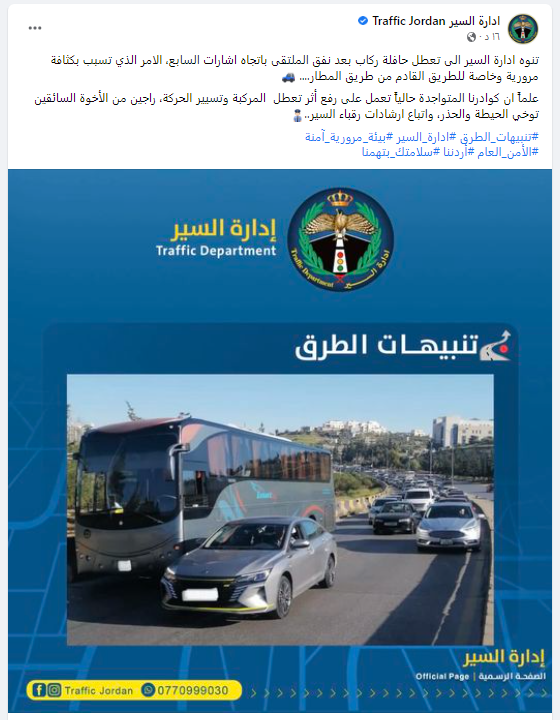 وقالت إدارة السير المركزية في ادراج لها عبر فيسبوك، إن “كوادرها العاملة في الميدان تعمل حاليًا على رفع أثر تعطل المركبة وتسيير الحركة”، داعية المواطنين سالكي الطريق إلى توخي الحيطة والحذر، واتباع إرشادات رقباء السير.