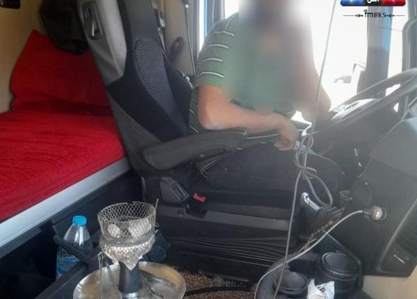 وكالة الناس – ضبط العاملون في ادارة الدوريات الخارجية، سائق مركبة شحن يدخن الارجيلة أثناء المسير طريق شويعر.