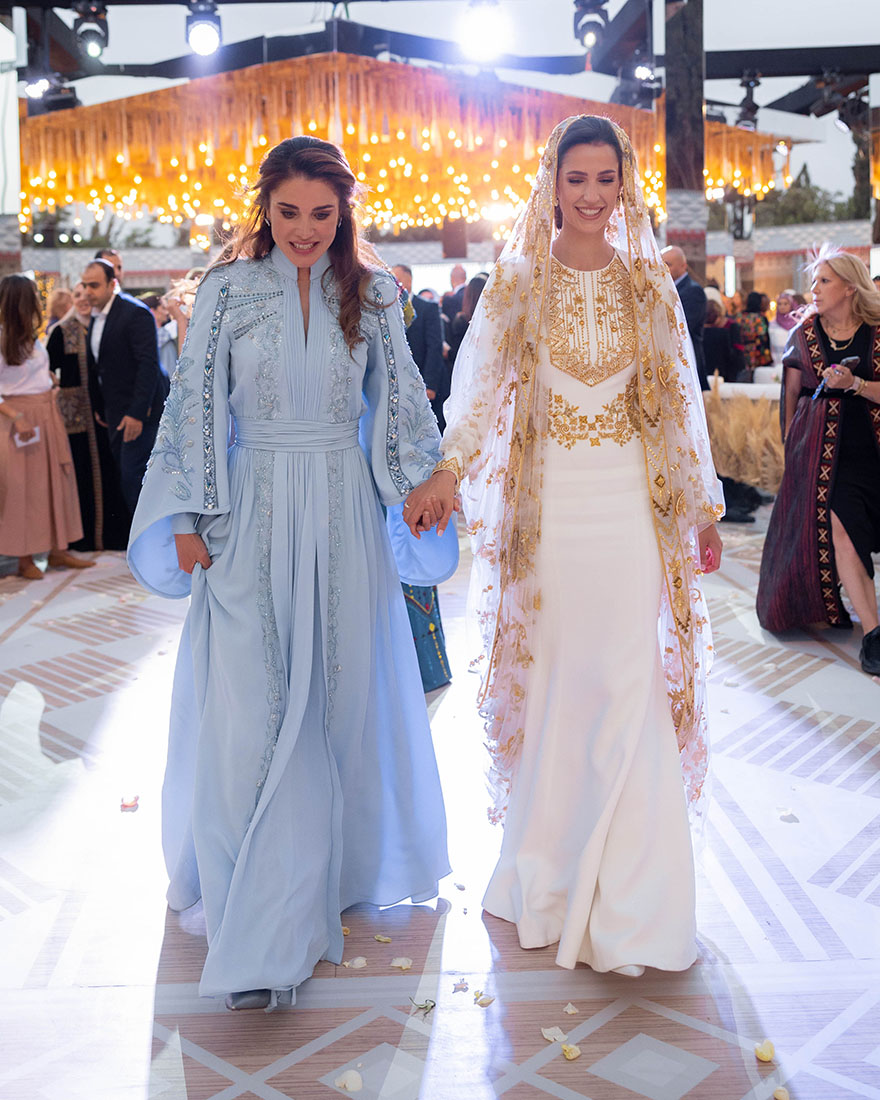 وأضافت جلالتها، “وأخيراً صار عندي كِنة! بس مش أي كِنة ما شاء الله عليها رجوة يعني ما بعرف في أحلى أو ألذ منها العروس؟ جد غلاوتها من غلاوة إيمان وسلمى. بتذكر من أكمن شهر لمّا خبرنا حسين، سيدنا وأنا، أنه نوى يتزوج قديش كانت فرحتنا. رجوة هي أحلى رجاء مني لرب العالمين لحسين”.