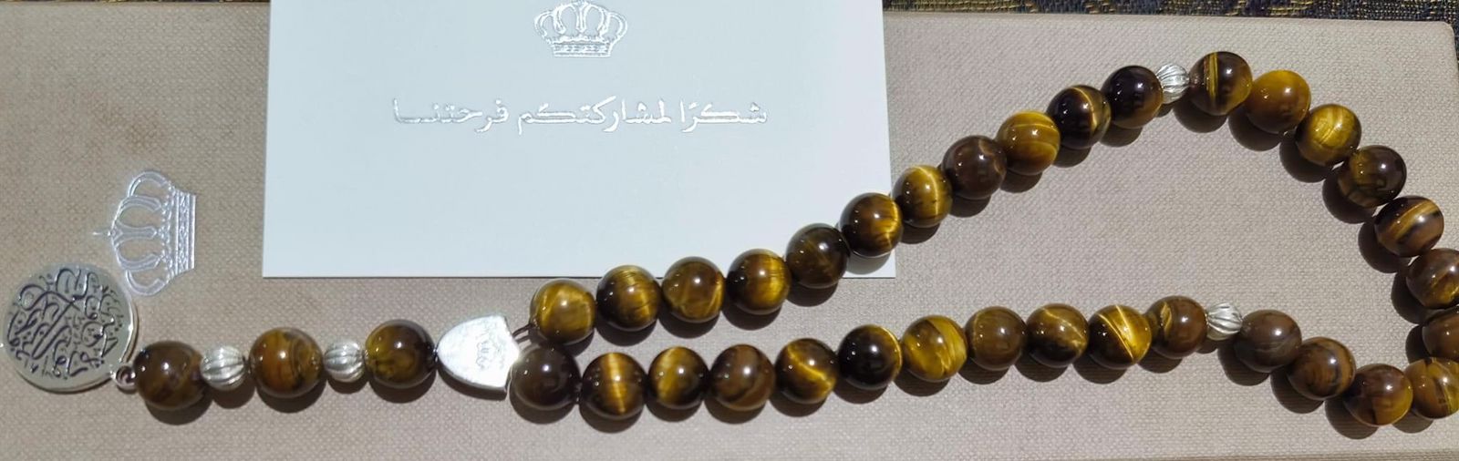 والسبحة مرفق معها قطعة حديدية منقوش عليها اسم سمو ولي العهد والآنسة رجوة السيف.