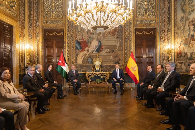 وأكد جلالته أن الأردن وإسبانيا شركاء في السعي نحو السلام والازدهار بالمنطقة والعالم، ويعملان على مواجهة أثر التغير المناخي على أمن الغذاء والطاقة، كما تربط البلدين شراكة متجذرة في مجالات الاقتصاد والتنمية والعمل الإنساني.