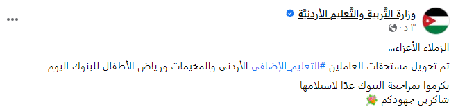 وقالت الوزارة، في منشور لها عبر منصة فيسبوك، “الزملاء الأعزاء،.. تم تحويل مستحقات العاملين التعليم الإضافي الأردني والمخيمات ورياض الأطفال للبنوك اليوم. تكرموا بمراجعة البنوك غدًا لاستلامها. شاكرين جهودكم”.