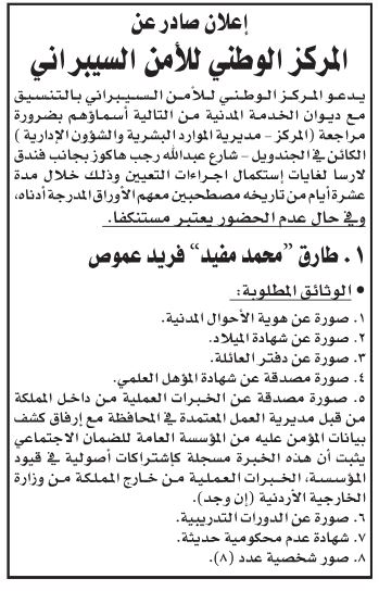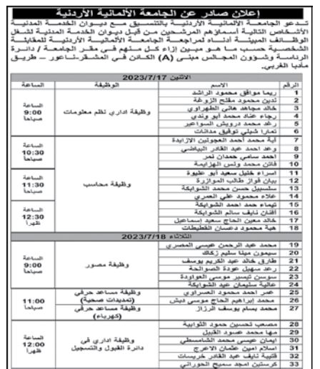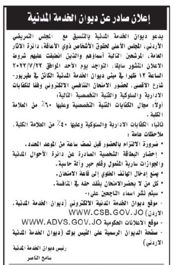 وكالة الناس – دعا ديوان الخدمة المدنية اليوم الاربعاء بالتنسيق مع عدد من الوزارات والمؤسسات الرسمية، عدداً من المرشحين لحضور الامتحان التنافسي وإجراء المقابلات الشخصية.
