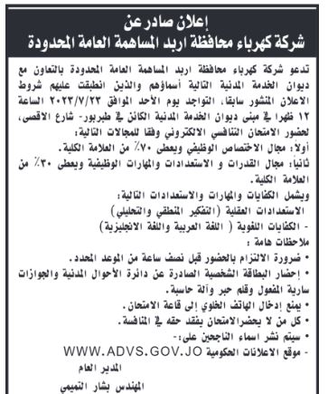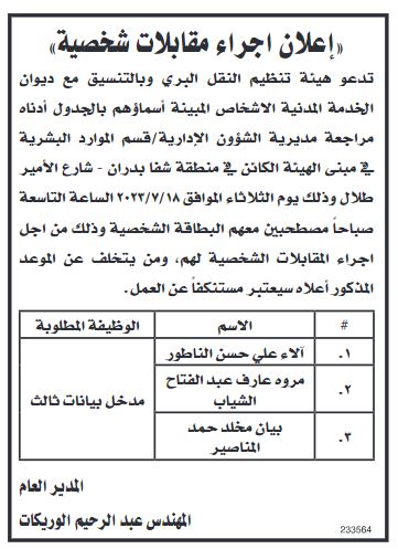 مدعوون لإجراء المقابلات الشخصية (أسماء) On يوليو 13, 2023 Share وكالة الناس – دعت هيئة تنظيم قطاع النقل البري وشركة كهرباء محافظ إربد، اليوم الخميس، مرشحين لإجراء المقابلات الشخصية، وذلك بالتنسيق مع ديوان الخدمة المدنية. وتاليا التفاصيل: