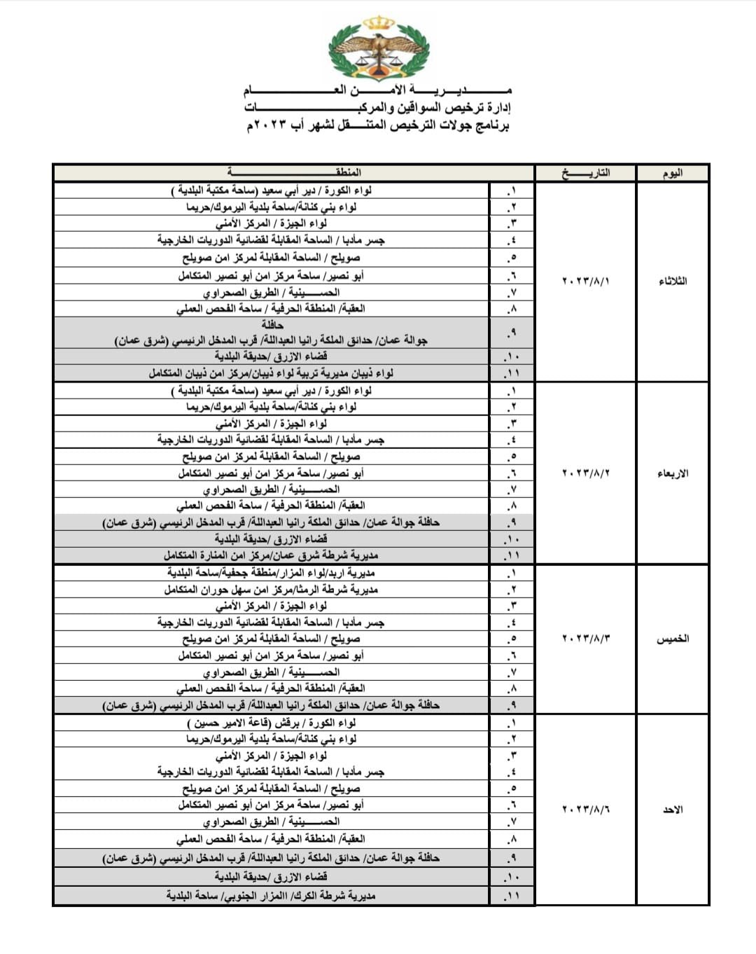 مواعيد العمل بجولات الترخيص المتنقل .. On يوليو 31, 2023 Share وكالة الناس – اعلنت إدارة ترخيص السواقين والمركبات عن مواعيد العمل بجولات الترخيص المتنقل ضمن المبادرة الابتكارية ( بنوصلك ) خلال شهر آب لعام 2023 م في عدد من مناطق الأردن . وتالياً التفاصيل :