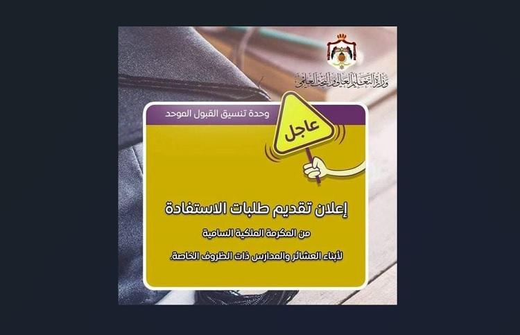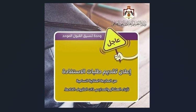 وكالة الناس – تعلن اللجنة العليا للمكرمة الملكية السـامية لأبناء العشائر في مـدارس البـادية الأردنية والمدارس ذات الظـروف الخاصة في وزارة التعليم العالي والبحث العلمي عن بدء تقديم طلبات الاستفادة من المكرمة الملكية السامية للعام الجامعي 2023-2024، وذلك اعتباراً من صباح يوم السبت الموافق 26 / 8 / 2023 وحتى الساعة الثانيـة عشرة ليلاً من يوم الخميس الموافق 31 / 8 / 2023 علماً بأن تقديم طلب الاستفادة من هذه المكرمة سيكون إلكترونياً من خلال الموقع الالكتروني لوحدة تنسيق القبول الموحد، ويتم دفع رسم طلب الاستفادة من هذه المكرمة باستخدام آلية الدفع الالكتروني عن طريق “خدمة تسديد الفواتير من البنك المركزي الأردني” إي-فواتيركم (eFAWATEERcom)، وذلك بعد تثبيت طلب الاستفادة من هذه المكرمة. شروط الاستفادة من المكرمة الملكية السامية: