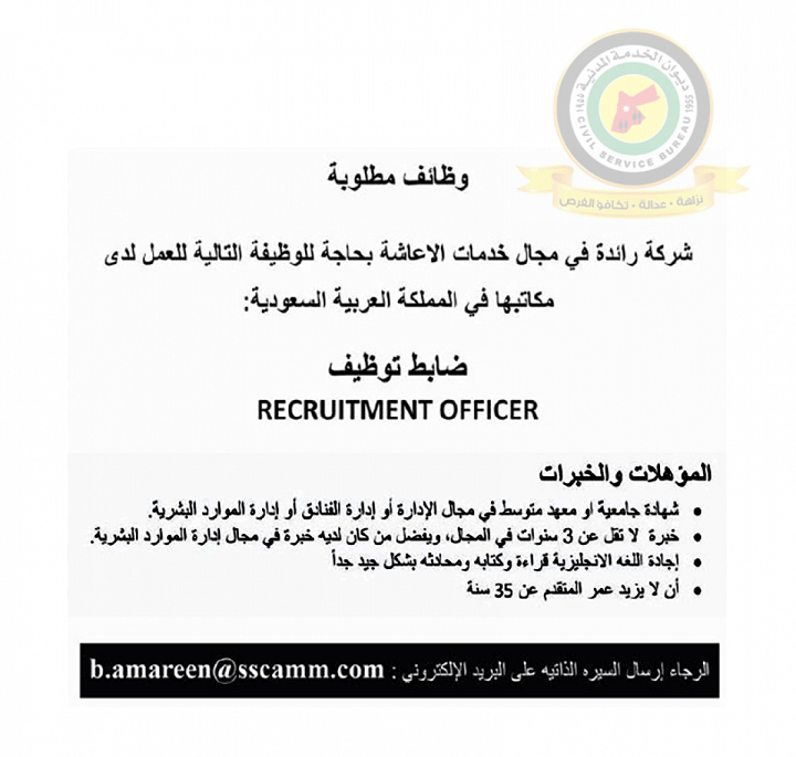 ووفقا للإعلان، فان الشركة تسعى لتعيين أردني بوظيفة ضابط توظيف للعمل في السعودية.