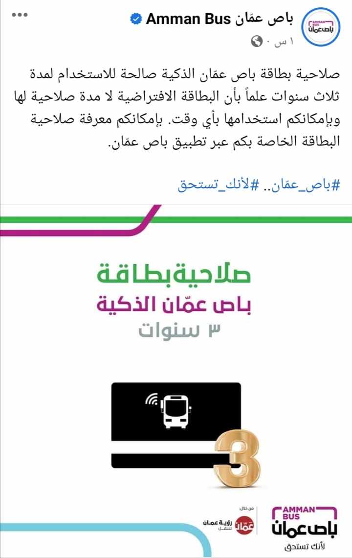 وأضاف في منشور له عبر صفحته على الفيسبوك: “البطاقة الافتراضية لا مدة صلاحية لها وبإمكانكم استخدامها بأي وقت ومعرفة صلاحية البطاقة الخاصة بكم عبر تطبيق باص عمّان”.