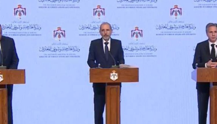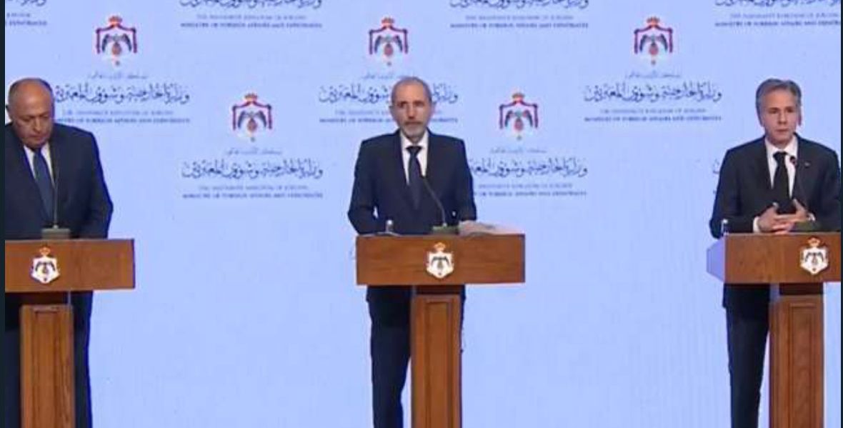 وقال الصفدي خلال مؤتمر صحفي عقده مع وزير الخارجية الأمريكي انتوني بلينكن والمصري سامح شكري، إن نقاط الالتقاء هذه تشمل ايصال الدعم الانساني إلى غزة، واستئناف تقديم الخدمات الإنسانية فيها، وحماية المدنيين، والالتزام بالقانون الدولي، وإطلاق المدنيين، ورفض التهجير.