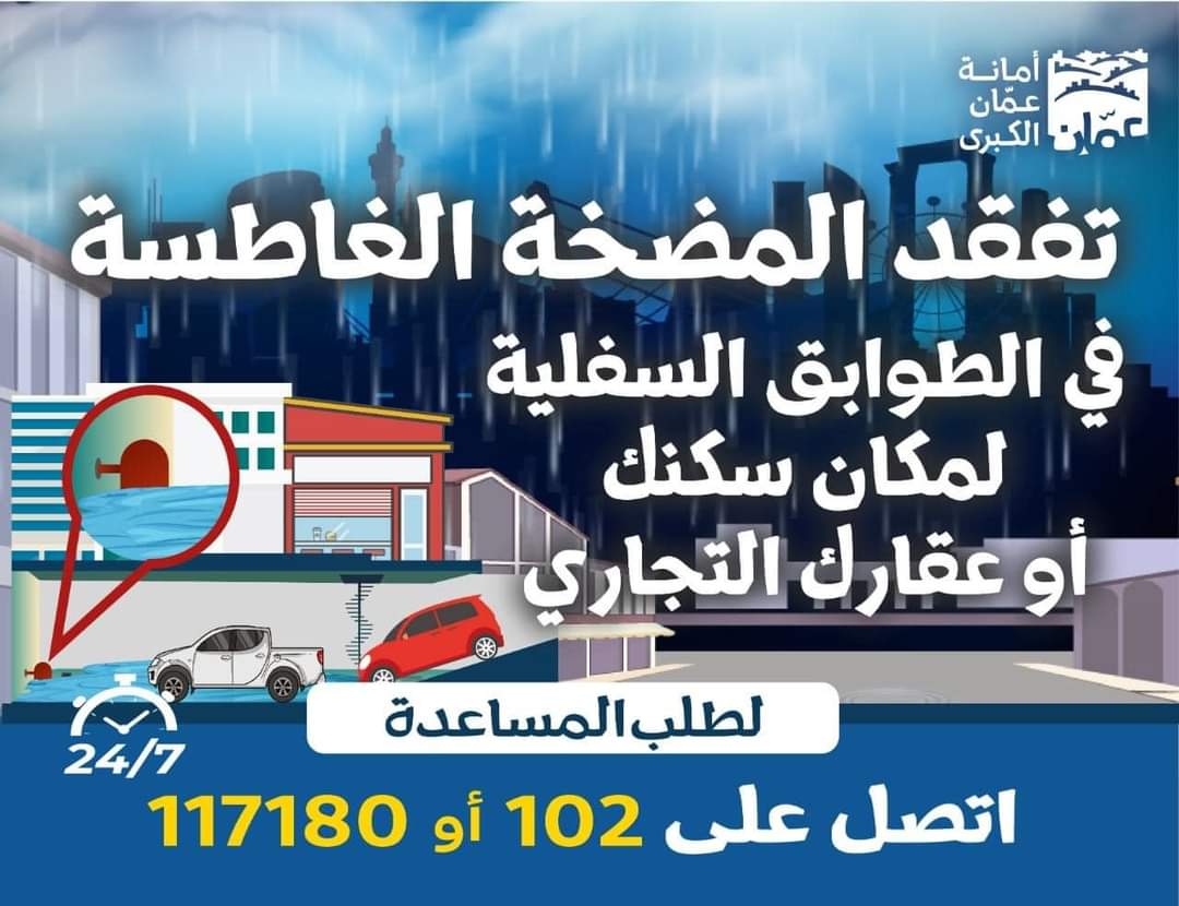 ودعت الأمانة في منشور لها عبر صفحاتها في مواقع التواصل الاجتماعي إلى تفقد المضخة الغاطسة لمياه الامطار في الطوابق السفلية والتسوية للمباني والمحلات التجارية، والابتعاد عن المناطق المنخفضة ومجاري السيول.