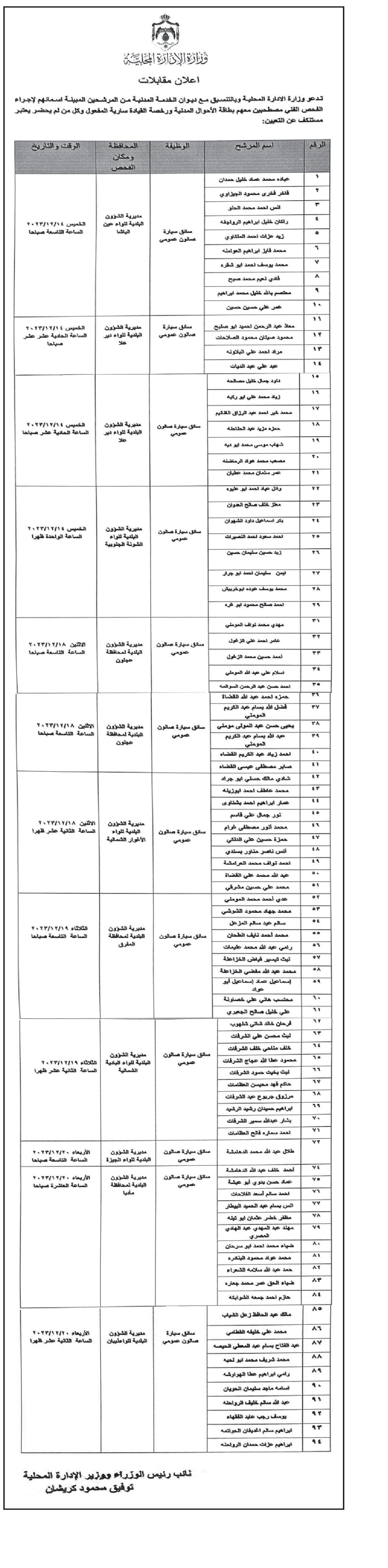 وكالة الناس – دعت وزارة الإدارة المحلية بالتنسيق مع ديوان الخدمة المدنية، مجموعة من المرشحين لإجراء الفحص الفني.