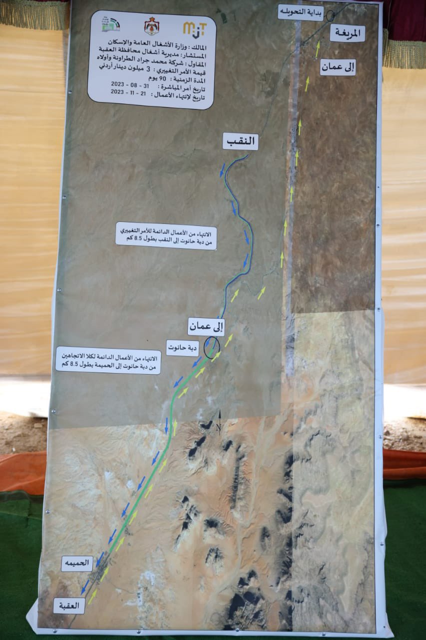 جاء ذلك سلسلة جولاته الميدانيَّة وزياراته التفقُّديَّة، حيث افتتح الطَّريق الصَّحراوي الممتدّ من منطقة نزول النَّقب إلى منطقة الحميمة، والواقع ضمن اختصاص محافظتيّ معان والعقبة، بعد إنجاز أعمال إعادة تأهيله وتحسينه، بطول 17 كم.