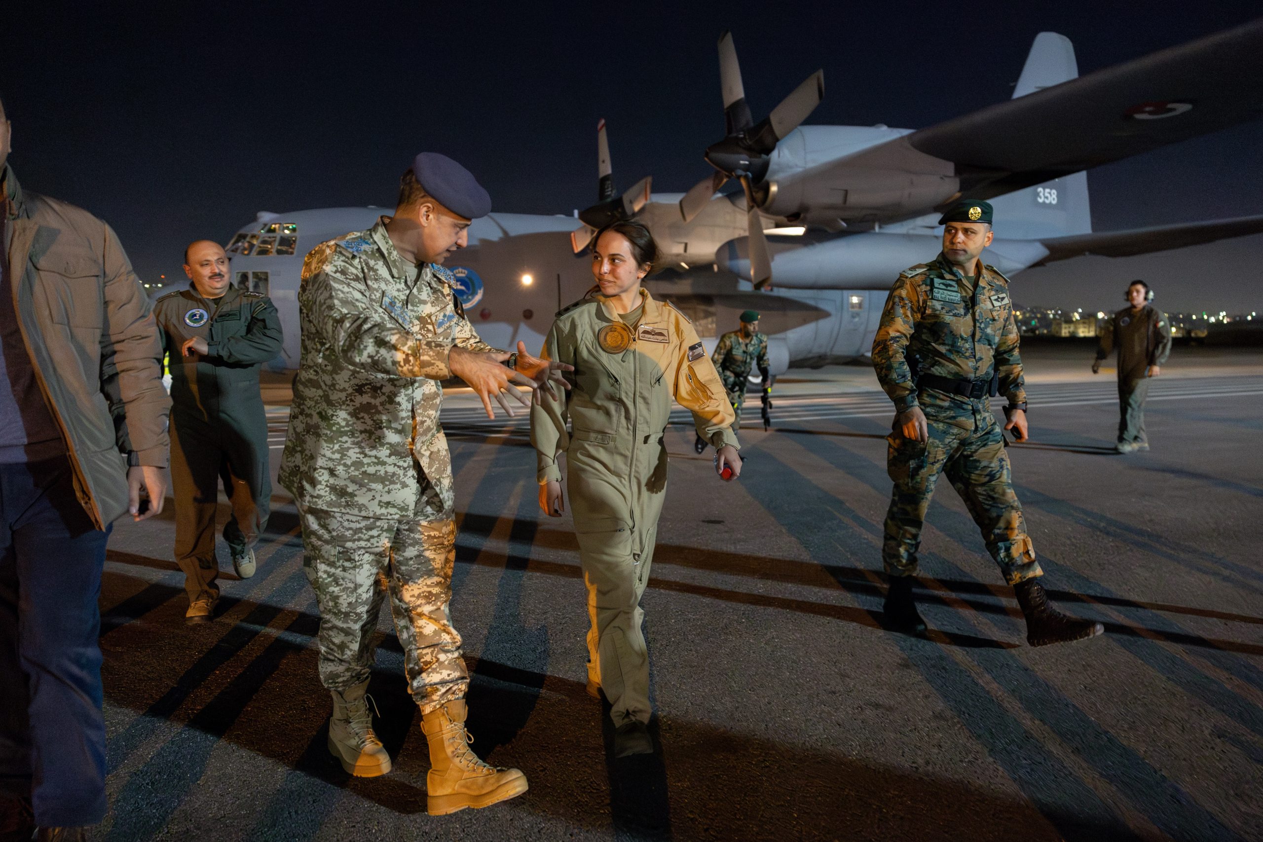 ورافقت طاقم الطائرة، التي سيرت بتوجيهات ملكية سامية، سمو الأميرة سلمى بنت عبدالله الثاني التي تحمل رتبة ملازم أول/طيار في سلاح الجو الملكي.