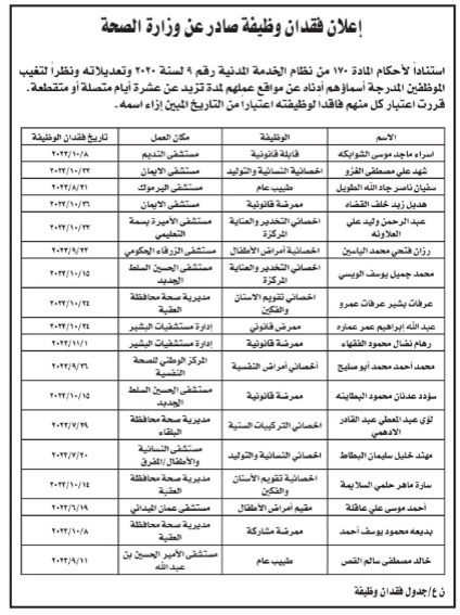 وكالة الناس – أعلنت وزارة الصحة اليوم الاثنين عن فقدان 18 موظفًا لوظائفهم؛ ذلك استنادا لأحكام المادة 170 من نظام الخدمة المدنية رقم 9 لسنة 20220 وتعديلاته.