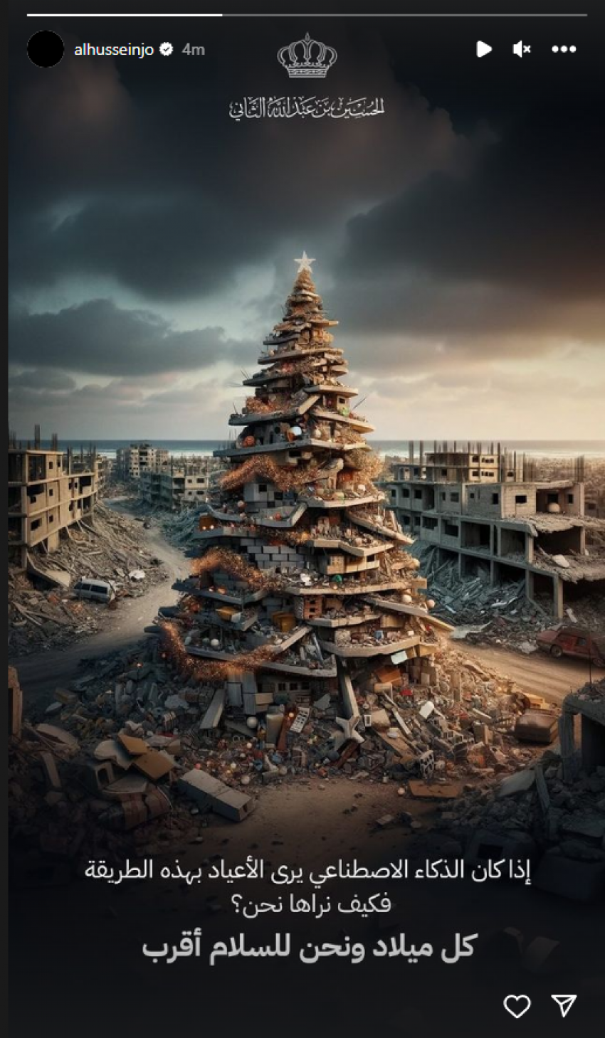 ولي العهد: كل عام ونحن للسلام أقرب On ديسمبر 24, 2023 Share وكالة الناس – نشر سمو الامير الحسين بن عبدالله الثاني، ولي العهد، صورة بمناسبة عيد الميلاد المجيد الذي يصادف يوم غد الإثنين. وعلق ولي العهد على الصورة، ” اذا كان الذكاء الاصطناعي يرى الأعياد بهذه الطريقة فكيف نراها نحن؟.. كل عام ونحن للسلام أقرب” عدد الم