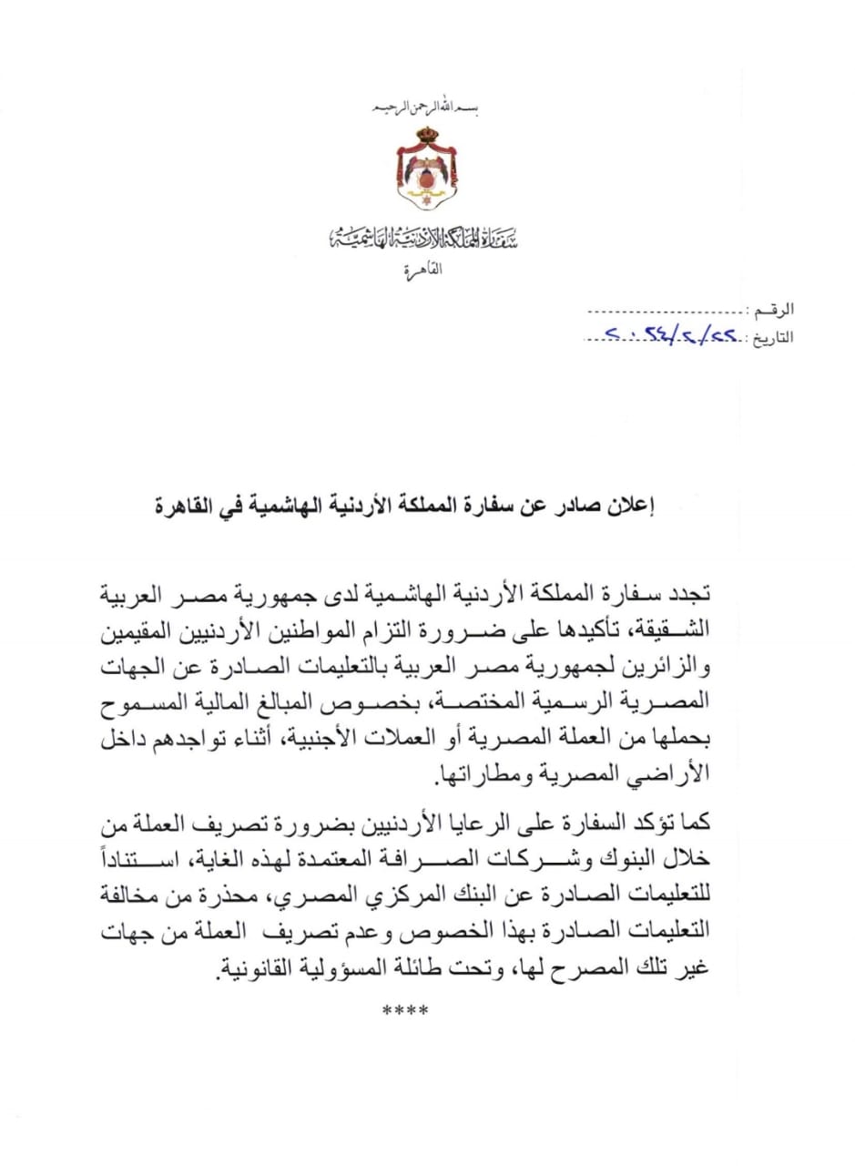 بيان للسفارة الأردنية في القاهرة: ضرورة الالتزام بتعليمات تصريف وحمل العملة في مصر