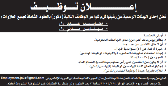وظائف شاغرة للذكور لدى هيئة رسمية