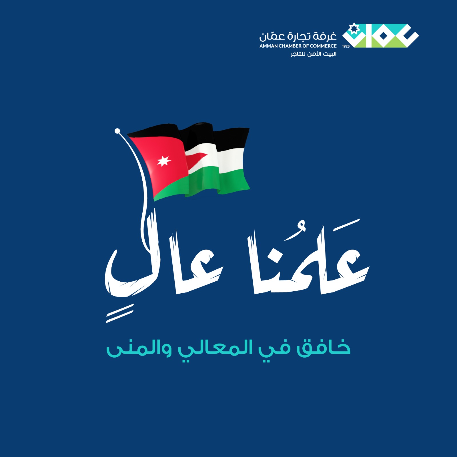 وكالة الناس -دعى مجلس ادارة غرفة تجارة عمان، جميع اعضاء الهيئة العامة ومنتسبي الغرفة لرفع العلم الأردني على مباني كل المؤسسات والشركات والمحال التجارية للقطاع التجاري والخدمي، إستجابة للحملة الوطنية الرابعة “علمنا عال” التي تنفذها وزارة الثقافة بالشراكة مع مؤسسات الدولة المختلفة، للاحتفاء باليوم الوطني للعلم الأردني، الذي يصادف 16 نيسان من كلّ عام، والتي تأتي ضمن احتفالات المملكة باليوبيل الفضي لجلوس جلالة الملك عبد الله الثاني على العرش.