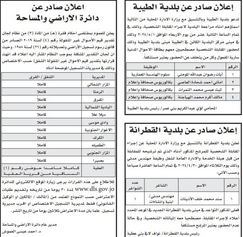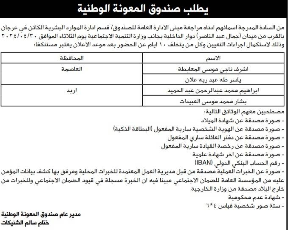 وكالة الناس -دعت عددا من الوزارات والمؤسسات الحكومية، اليوم الأحد، مرشحين للتعيين لإشغال شواغر وظيفية لديها.