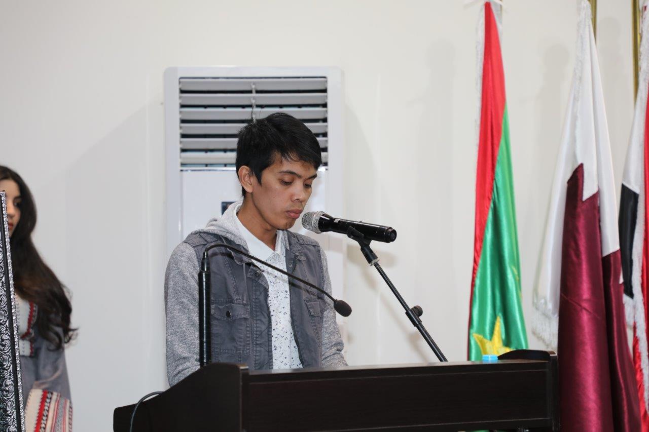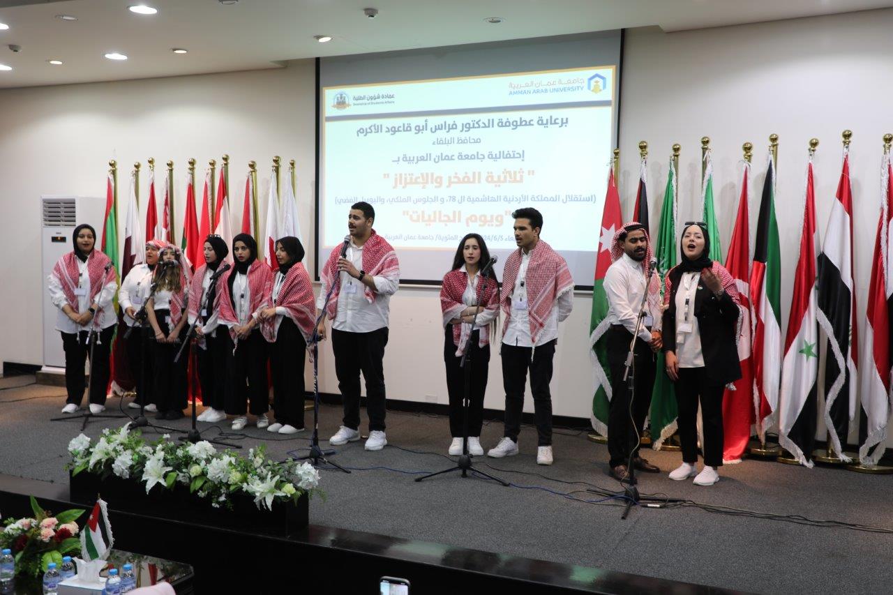 من جهته قال الدكتور خالد بني حمدان عميد شؤون الطلبة بأن جامعة عمان العربية تحتفل بثلاثية الفخر والاعتزاز تأكيداً منا أن الوطن هو الحاضن للماضي والحاضر والمستقبل وهو في القلوب والوجدان إلى الأبد ، وأشار بأن عيد الاستقلال نبراسٌ لما تنطوي عليه الذكرى من قيم سامية وغايات نبيلة كخدمة الوطن، وإعلاء كلمته والمحافظة على هويته ومقوماته والدفاع عنه وتعزيز نهضته ، وبين بأن الجامعة تعتز بحضور ضيوفنا من سفراء وملحقين ثقافيين ودبلوماسيين من ضيوف الأردن الأكارم بيننا ونقدر رعايتكم لأبنائنا الطلبة من خلال احتفالنا بيوم الجاليات .