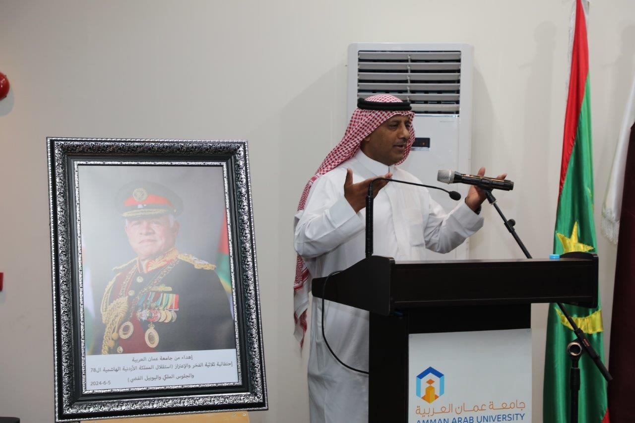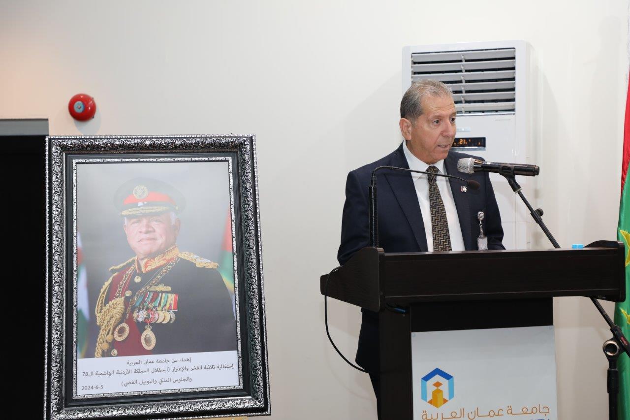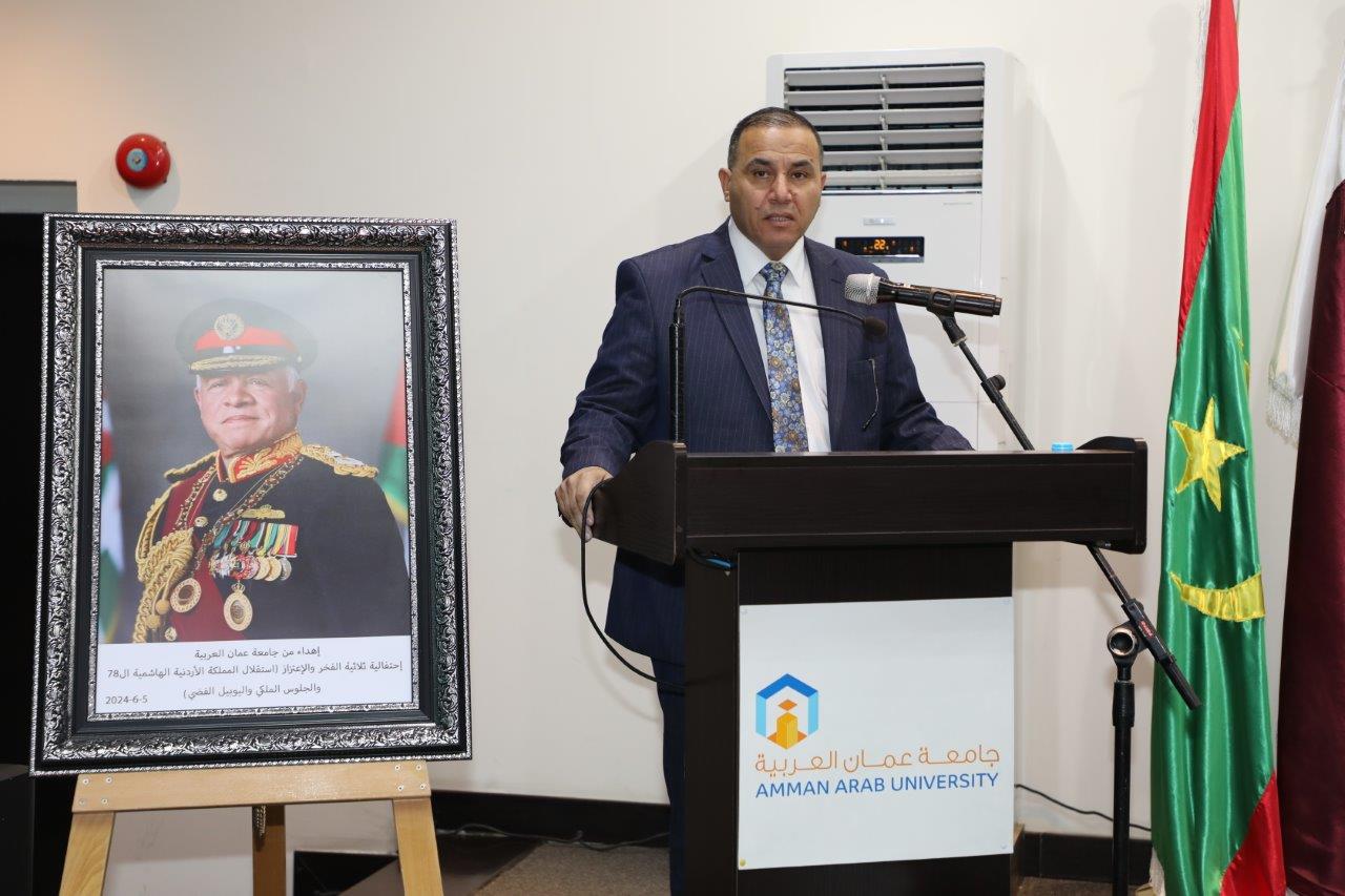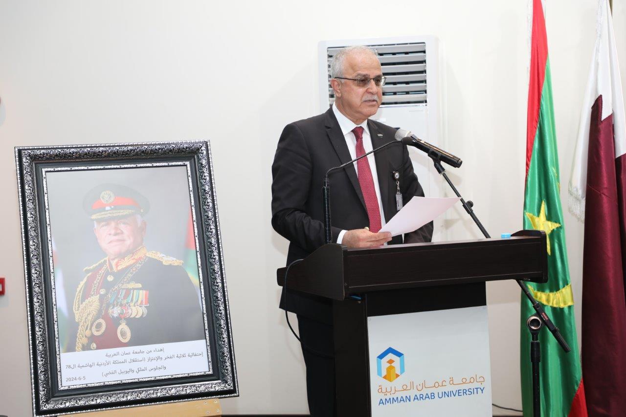 بدوره قال الدكتور الوديان خلال كلمته بأننا اليوم في جامعة عمان العربية نحتفل بعيد الاستقلال 78 الذي يصادف الخامس والعشرين من أيار، ونستذكر فيه إعلان المملكة الأردنية الهاشمية دولةً مستقلةً استقلالاً ، ومنذ ذلك الحين والهاشميون الأشراف يحملون راية الحكم جيلاً بعد جيل قادوا مسيرتها بحكمةٍ واقتدار، وقدموا التضحيات ومن خلفهم الأردنيون الأحرار ليكون الأردنُّ دولةً حرةً مستقلة يكتمل بنيانها ويترسخ كيانها ، بالإضافة إلى الاحتفال باليوبيل الفضي لتسلم جلالة الملك عبدالله الثاني سلطاته الدستورية الذي هلّ علينا متزامناً مع ذكرى الاستقلال، فعلى مدى الخمسة والعشرين عاماً وجلالته يتولى مقاليد الحكم متابعاً مسيرة البناء والتطوير التي بدأها المغفور له جلالة الملك الحسين بن طلال طيب الله ثراه، فقد شهد الأردن خلالها تحولات جذرية على مستوى جميع الأصعدة سياسياً واقتصادياً واجتماعياً، وتميزت تلك المرحلة بإصلاحاتٍ جوهرية وتطورات ملموسة في مختلف القطاعات من التعليم والصحة الى الدبلوماسية وغيرها تظهر بدورها رؤية جلالة الملك الشاملة وترجمتها لنهضةٍ شاملة وتعزيز مكانة الأردن وصموده كقوة للاستقرار والتقدم في وسط إقليمي ودولي يعجُ بالتحديات ساعياً جلالته لتحقيق آمال الأمة وتعزيز عروبتها منطلقاً من ثوابته متبنياً قضاياه المصيرية ولا سيما القضية الفلسطينية ساعياً لحلها حلاً شاملاً عادلاً وإقامة دولة فلسطين المستقلة على التراب الوطني الفلسطيني وعاصمتها القدس الشرقية، ومحافظاُ على الوصاية الهاشمية على المقدسات الإسلامية والمسيحية فيها.