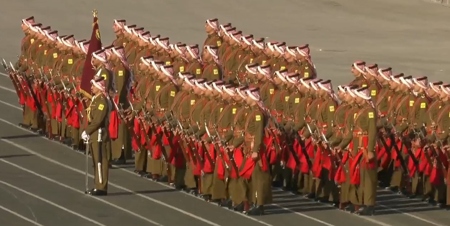 ثم تقدمت الأعلام والرايات، وتوقف جلالة الملك والحضور لتحيتها، ثم تلتها وحدات الشرطة الملكية مشكلة الرقم 25، وتبعتها الخيالة والهجانة.