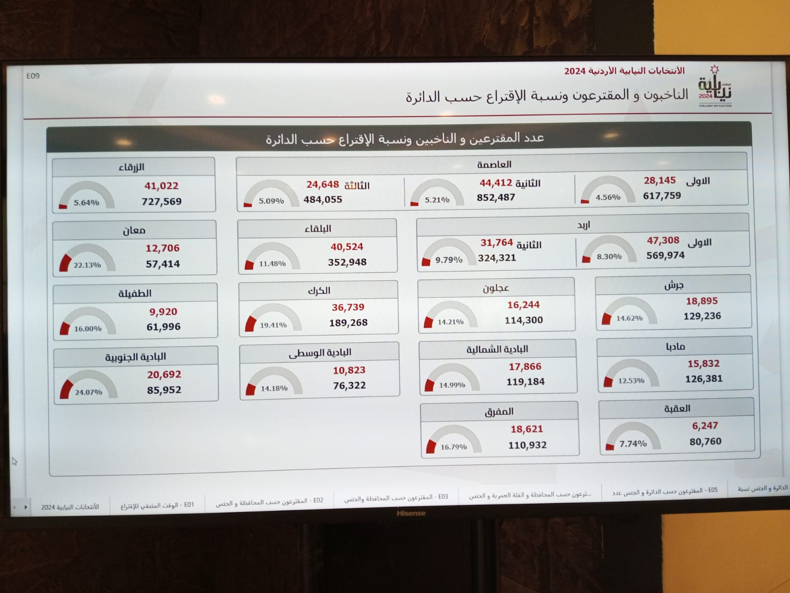 وسجلت البادية الجنوبية أعلى نسبة اقتراع حيث وصلت 23.8% في حين سجلت عمان الاولى أدنى نسبة اقتراع بـ 4.5% من إجمالي عدد الناخبين.