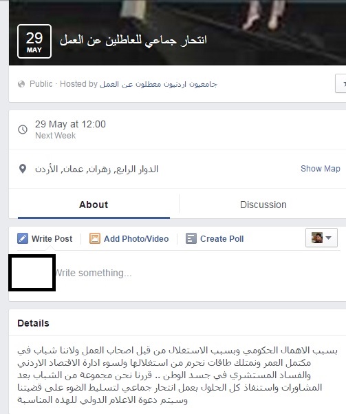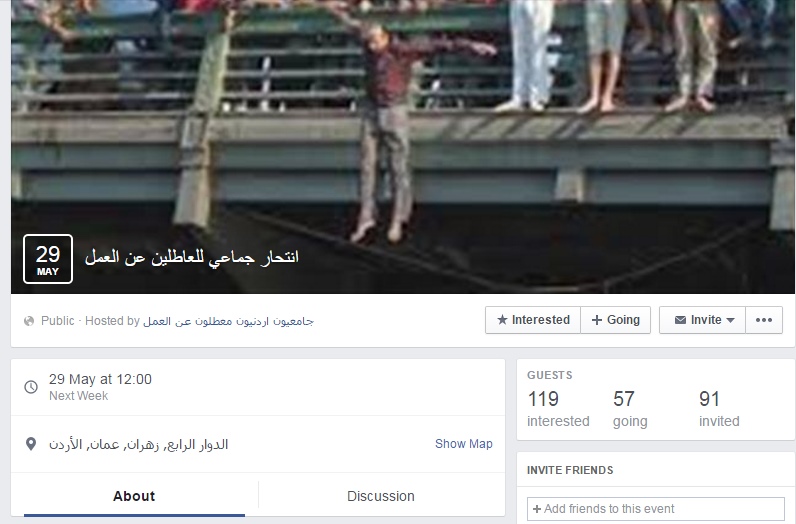 وكالة الناس – انشأ رواد مواقع التواصل الاجتماعي على موقع الفيس بوك منصة دعوا بعضهم اليها وهي عبارة عن دعوة لعملية انتحار جماعية سيلجأ إليها العاطلون عن العمل في منطقة الدوار الرابع حي زهران بالعاصمة عمان.