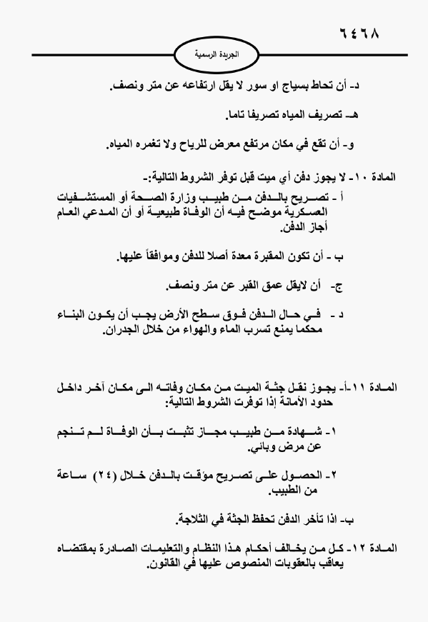 وبحسب المادة 7 فإنّه مع مراعاة أحكام التشريعات المتعلقة بالأراضي فلمجلس الأمانة وبناء على تنسيب الأمين احداث مدافن جديدة في الحالات التالية: