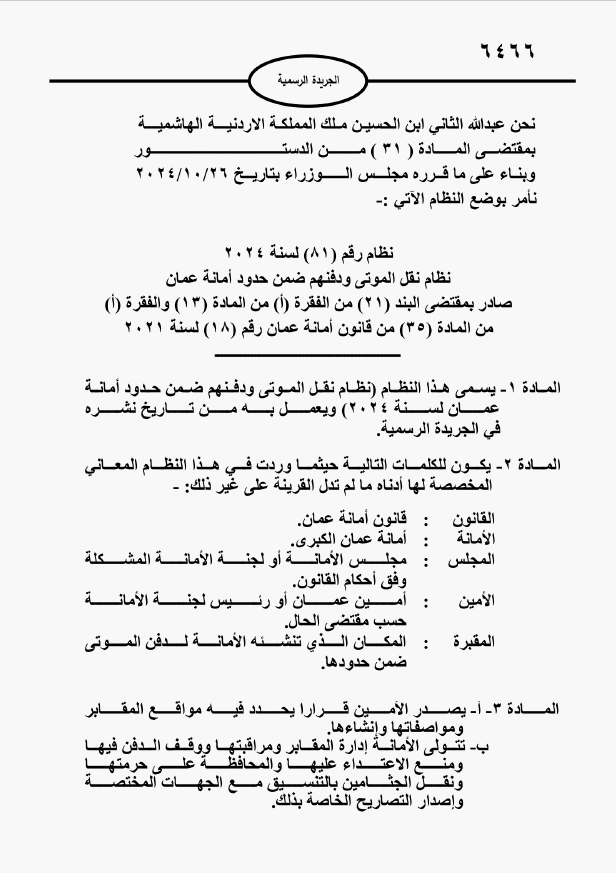 وكالة الناس -صدر في عدد الجريدة الرسمية اليوم، نظام نقل الموتى ودفنهم ضمن حدود أمانة عمان بمقتضى المادة 35 من قانون أمانة عمان.