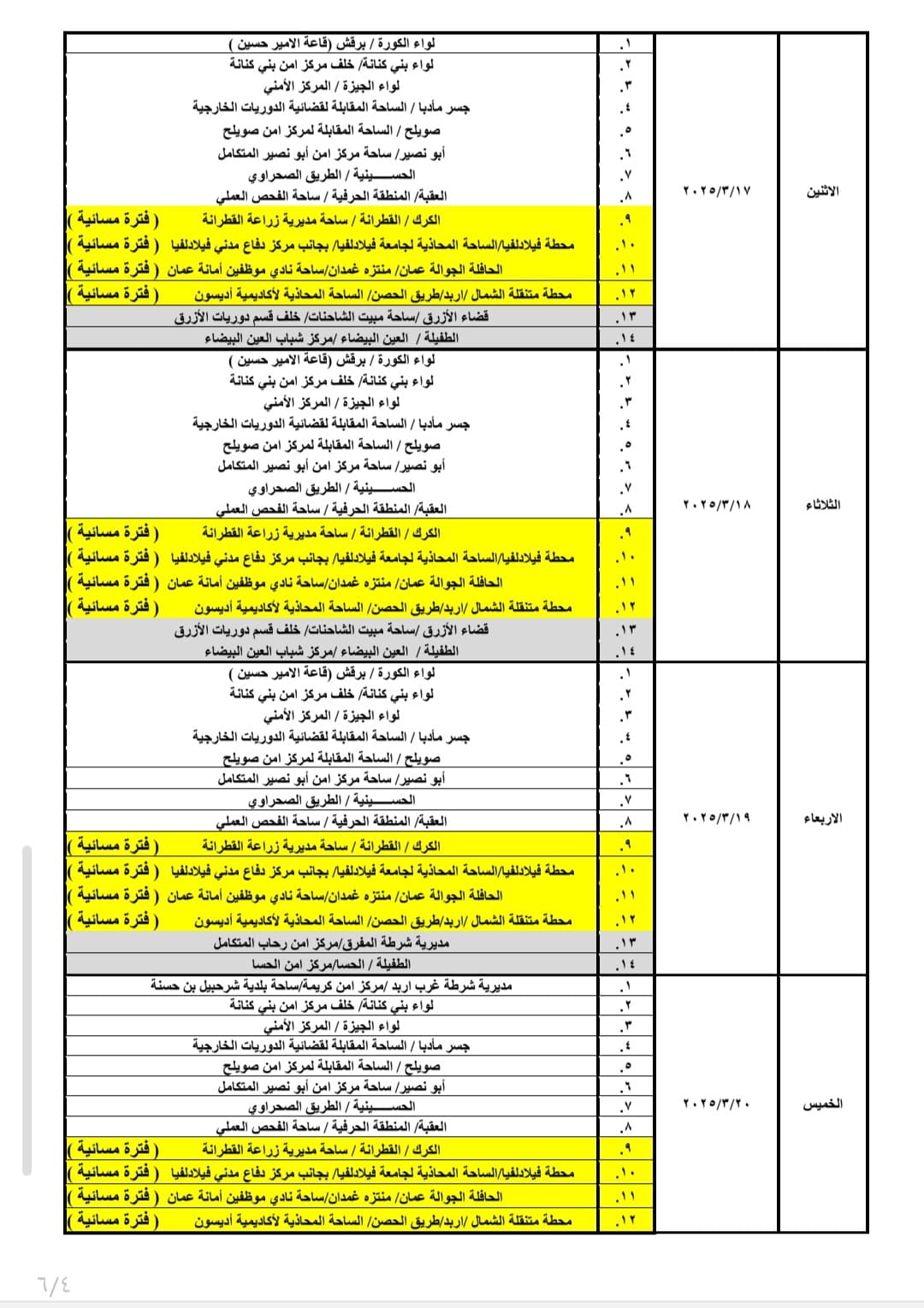 وتاليا جدول العمل والدوام ضمن الأوقات المعلنة: