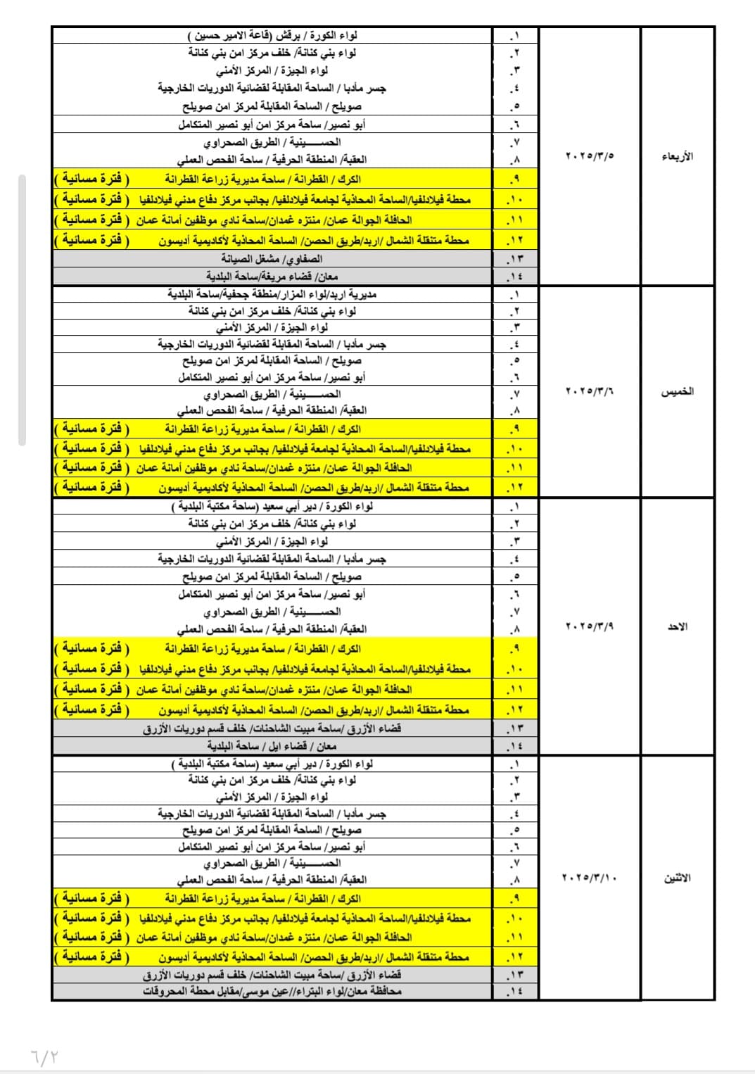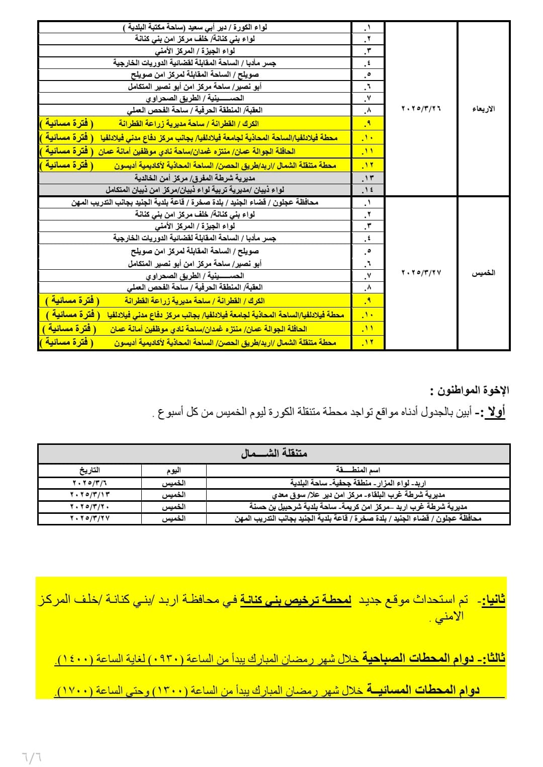 وفيما ستكون ساعات الدوام للمحطات المتنقلة المسائية من يوم الأحد ولغاية يوم الخميس من الساعة 1:00 ظهراً وحتى الساعة 5:00 مساءًا.