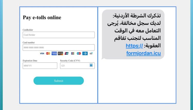 وكالة الناس – حذّر الناطق الإعلامي باسم مديرية الأمن العام المواطنين من رابط احتيالي يرد على هواتف المواطنين ومروّس باسم الشرطة الأردنية ويدعوهم للدخول للحصول على سجّل للمخالفات تجنّباً لتفاقمها.
