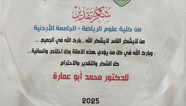 و من جهتها قامت كلية علوم الرياضة في الجامعة الأردنية بتقديم دروع شكر و تقدير ل : الدكتور محمد أبو عمارة و الأستاذ أحمد أبو عمارة، و تُعدّ هذه الفعالية نموذجًا حيًا للتكامل بين الجانب الأكاديمي وواقع سوق العمل، وتُجسّد رؤية الكلية في إعداد جيل مؤهل وقادر على التميز في مختلف الميادين المهنية والرياضية.