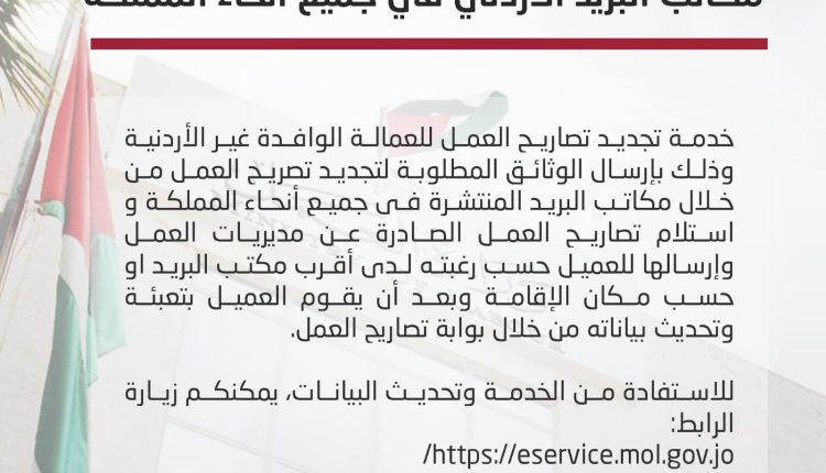 خدمة تجديد تصاريح العمل للعمالة الوافدة عبر مكاتب البريد الاردني