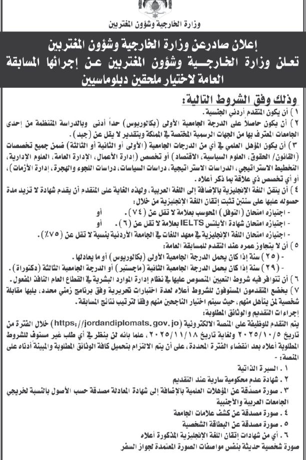 وكالة الناس -أعلنت وزارة الخارجية وشؤون المغتربين عن إجرائها المسابقة العامة لاختيار ملحقين دبلوماسيين، وفقًا لعدة شروط أبرزها أن يكون المتقدم أردنيَّ الجنسية، وأن يكون حاصلًا على الدرجة الجامعية الأولى (بكالوريوس) حدًّا أدنى والدراسة المنتظمة من إحدى الجامعات المعترف بها من الجهات الرسمية المختصة بالمملكة وبتقدير لا يقل عن (جيد).