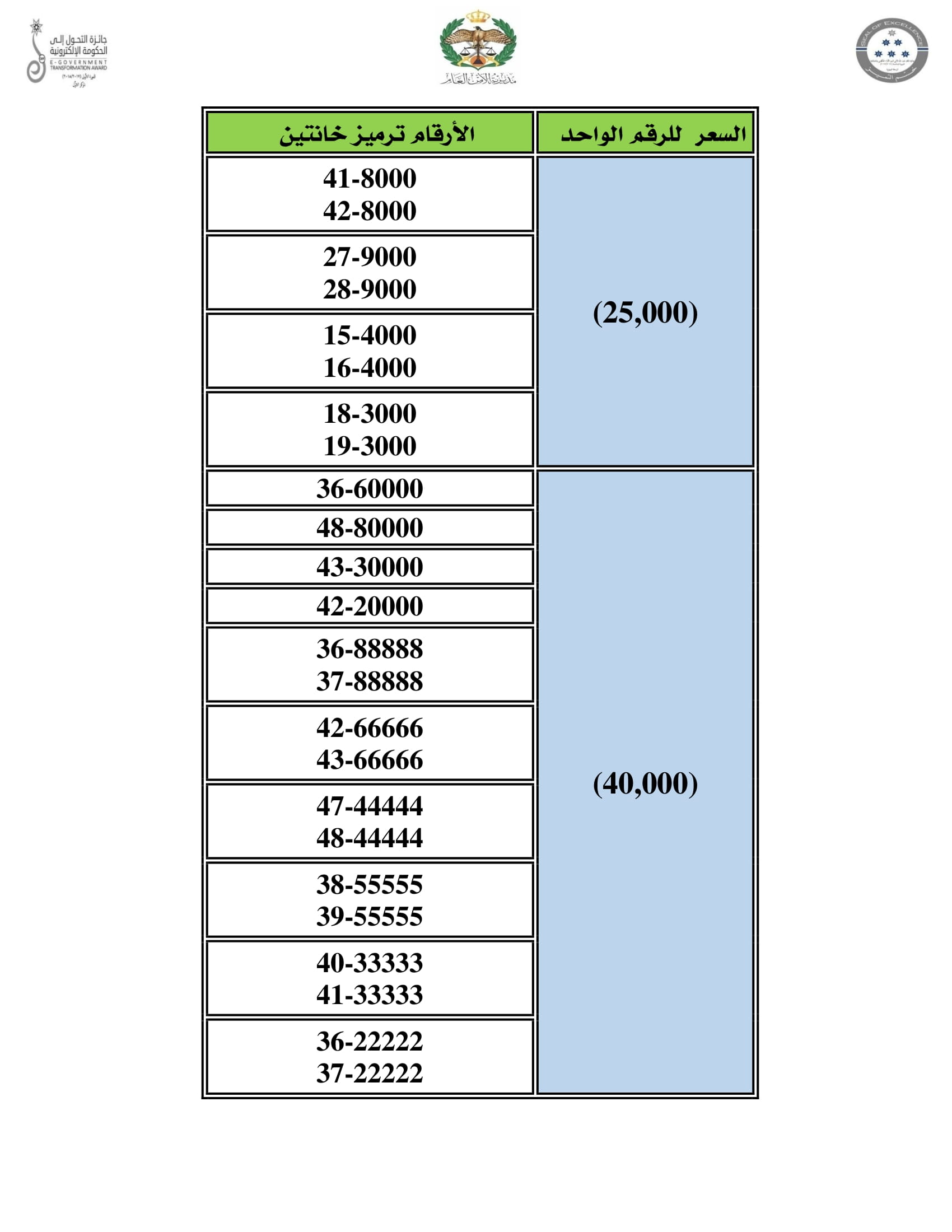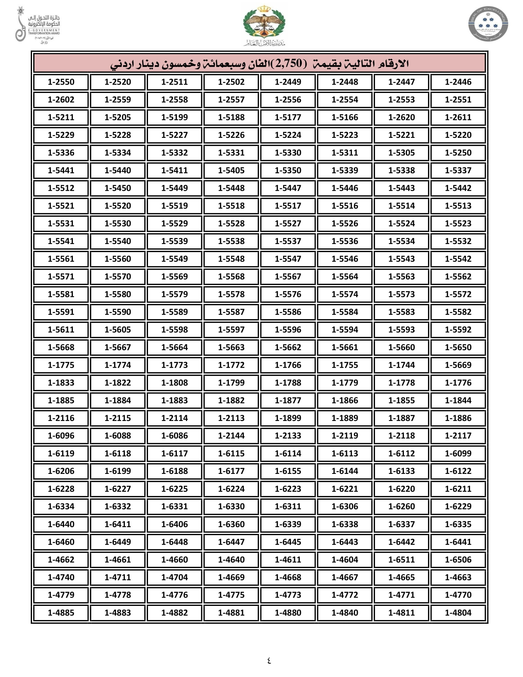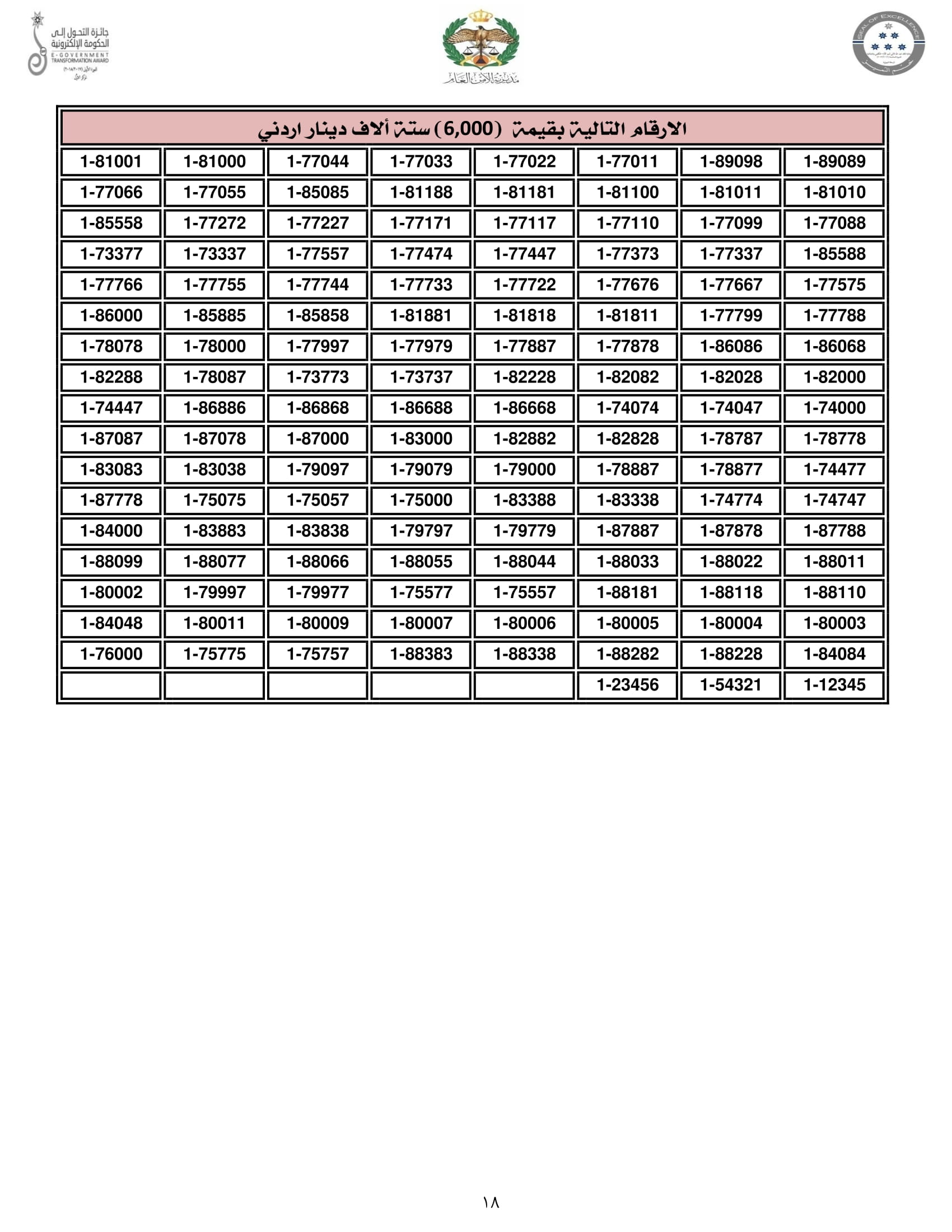 وستكون الأرقام ثنائية وثلاثية ورباعية وخماسية من مختلف الترميزات، والتي كان مقرراً بيعها بالمزاد العلني بأسعار تبدأ من 25 ألف دينار.