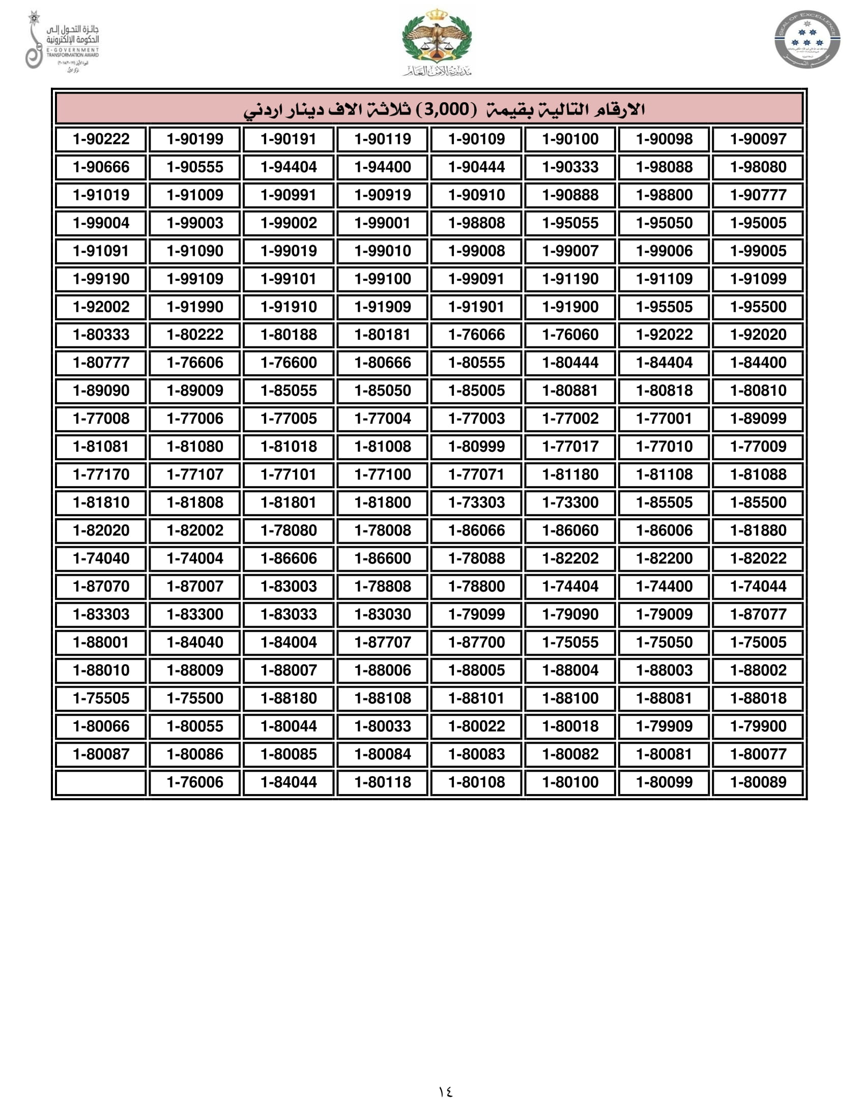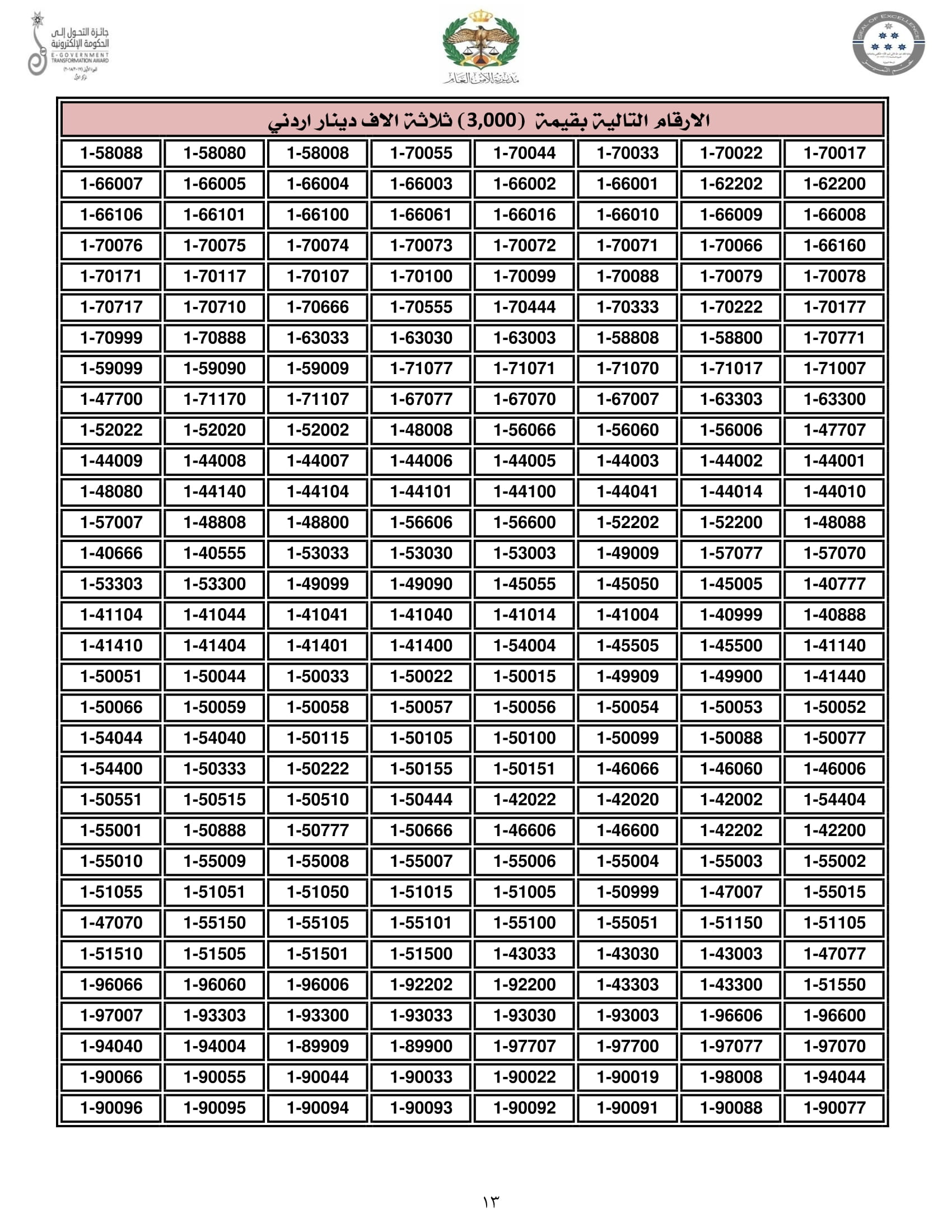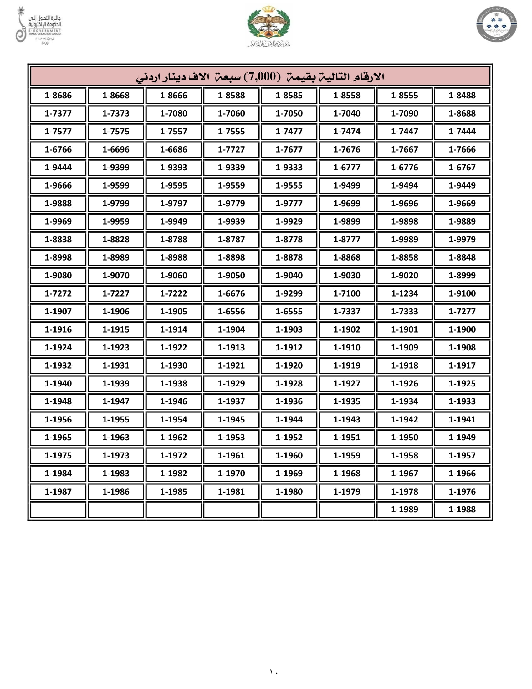 وستكون الأرقام ثنائية وثلاثية ورباعية وخماسية من مختلف الترميزات، والتي كان مقرراً بيعها بالمزاد العلني بأسعار تبدأ من 25 ألف دينار.