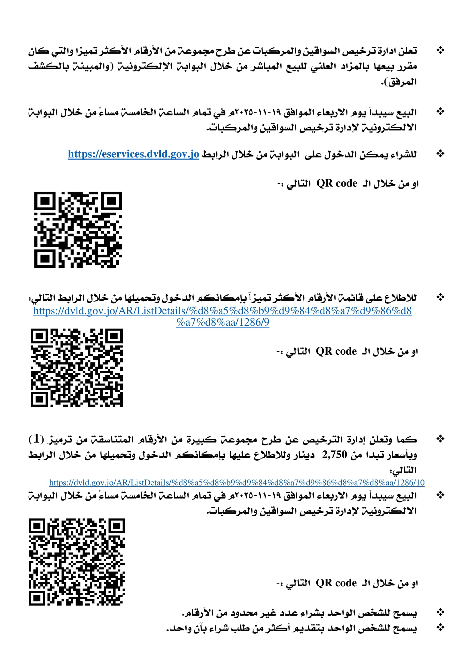 وأفادت الادارة أن البيع سيبدأ يوم الاربعاء الموافق 19-11-2025م في تمام الساعة الخامسة مساءً من خلال البوابة الالكترونية لإدارة ترخيص السواقين والمركبات.