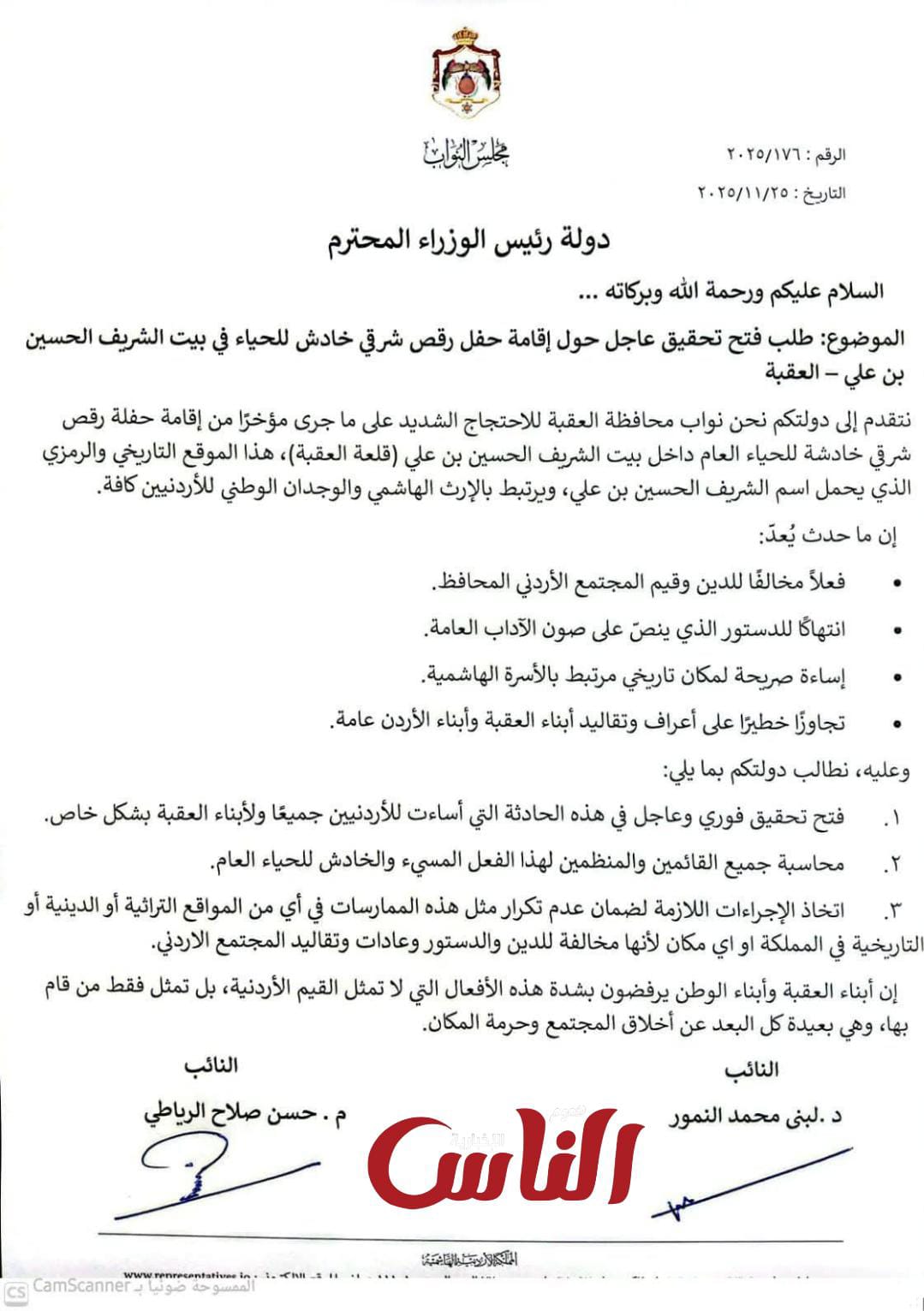 نتقدم إلى دولتكم نحن نواب محافظة العقبة للاحتجاج الشديد على ما جرى مؤخرًا من إقامة حفلة رقص شرقي خادشة للحياء العام داخل بيت الشريف الحسين بن علي (قلعة العقبة)، هذا الموقع التاريخي والرمزي الذي يحمل اسم الشريف الحسين بن علي، ويرتبط بالإرث الهاشمي والوجدان الوطني للأردنيين كافة.