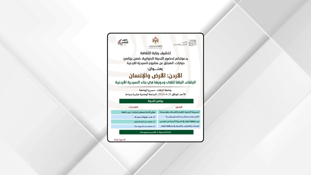 تنظّم وزارة الثقافة في جامعة البلقاء يوم غد الاحد ندوة حوارية ضمن برنامج حوارات المنبثق عن مشروع السردية الأردنية بعنوان: الأرض والإنسان- البلقاء، البلقا تلقى ودورها في بناء السردية الأردنية”.