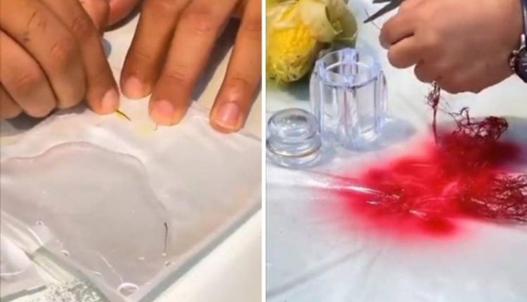 وقام الشخص بتجربة الزعفران المغشوش من خلال وضعه في المياه ولم يعطي أي لون، أما الأصلي فأعطى اللون الأصفر وذاب في الماء، حسبما أبان الفيديو.